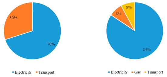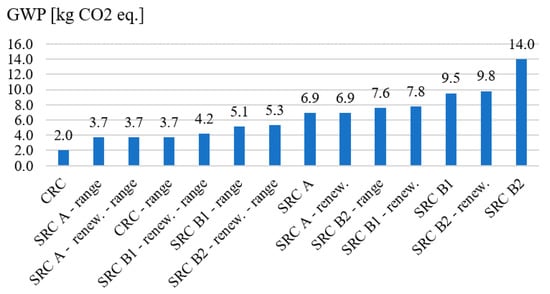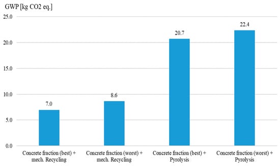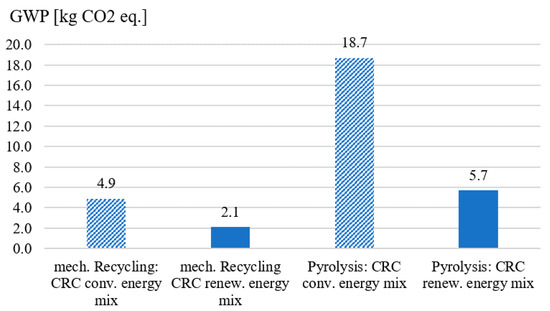 In our scenarios, the concrete fraction is demolished and crushed individually with fuel, and consequently with diesel, which has no impact on energy use and the electricity mix; thus, the emissions remain unchanged. However, the key factor for CRC is mechanical recycling and, in particular, pyrolysis. We assume that both recycling options are purely based on renewable energies [61]. With the substitution of the energy source, emissions are reduced by more than 50% for both options (conventional in diagonally striped muster and renewable in grey, as shown in Figure 10). In pyrolysis, savings as high as 70% can be achieved (Figure 6).