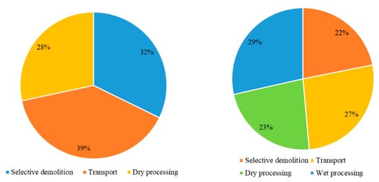 By analyzing scenarios B1 and B2, the following hotspots can be identified in terms of total GWP. Scenario B1 requires a large fraction of fuel for the selective demolition, leading to a fraction of 32% of the total GWP (3.1 kg CO2e of total 9.5 kg CO2e). The transport accounts for 39% of the total GWP emissions (as the complete wall was transported to the processing plant) and the dry processing accounts for the remaining 28% (Figure 9). In scenario B2, the innovative stationary processing plant additionally uses wet processing, which accounts for the largest share of GWP (8 kg CO2e of total 14 kg CO2e) due to the required energy, fuel, and water. The wet processing corresponds to 29%. Furthermore, transport has a large share of the GWP with 27%, followed by dry processing and selective demolition (Figure 9).