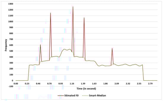 A state-of-the-art pitch detector algorithm, PYin [23], was employed to estimate the fundamental frequencies of each file. The implementation of the PYin in Librosa [31] was used as it is one of the well-known Python libraries. According to the studies by Faghih and Timoney [32,33], the PYin algorithm is a reliable pitch estimator for singing signals. However, it still returns incorrect estimates for some F0s. Therefore, the Smart-Median pitch smoother algorithm [34] was employed to smooth the pitch contours estimated by PYin. This smoother algorithm altered the wrongly estimated pitches, i.e., the outliers were edited by employing the median method. Figure 1 illustrates how the Smart-Median algorithm modifies a pitch contour to smooth sharp jumps.