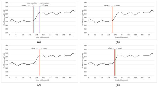 Points’ statuses on a pitch contour. There are two notes, E4 and F4, sung by a professional female singer. (a) Showing offset, the start of a transition, the end of a transition, and onset events in order. (b) The transition was not considered, and the onset started immediately after the offset point according to (a). (c) Similarly, the transition was not considered, but the offset was annotated to lie immediately before the onset point in (a). (d) Likewise, the transition was not considered, but the middle points between the onset and offset points in (a) are annotated as offset and onset.