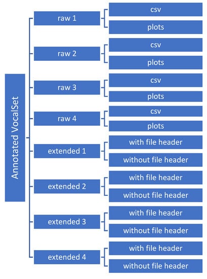 The directories’ hierarchy of the Annotated-VocalSet is depicted in Figure 4. The notes in the files in the “raw 1” and “extended 1” directories were calculated by considering a transition between notes, as depicted in Figure 3a. On the other hand, the notes in the other directories were estimated without considering a transition between notes. Therefore, for the estimated notes in the “raw 2” and “extended 2” directories, the onsets started immediately after the offsets, as shown in Figure 3b. Moreover, the files belonging to the “raw 3” and “extended 3” directories were calculated by considering the points before onsets as offsets, as illustrated in Figure 3c. In addition, the files in the “raw 4” and “extended 4” directories included the notes where their onset and offsets were estimated as the middle points between the offset and onset when a transition was considered between notes. As an illustration, the onset and offset points in Figure 3d are at the middle of the onset and offset points in Figure 3a.