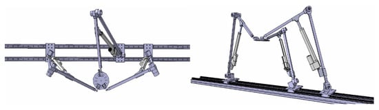 The mechanical structure model was designed and created in CATIA V5 according to the kinematic scheme of the robot structure illustrated in Figure 1. Stiffness, accuracy, and other performance characteristics were used to develop the robotic manipulator. Because workspace determines the extent to which a robot may be used, it is a crucial concern in the design process [16,17,19,20]. In Figure 2, the 3D model of the PKM structure is displayed.