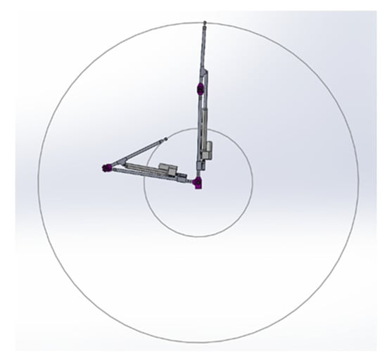 Considering the kinematic structure of the six DOF PKM, the three PR(RPR)RS share predefined support planes. The actuated (RPR) kinematic chain from the PR(RPR)RS kinematic chain imposes a fixed radius between the last joint of the chain, the spherical joint S, and the first revolute joint R of the chain. Depending on the total stroke of the actuated prismatic joint P from the (RPR) chain, a minimal and maximal radius are obtained, meaning that the PR(RPR)RS chain has a circular workspace, as shown in Figure 3, inside the support plane, centered in the revolute center of the first revolute joint R [20].