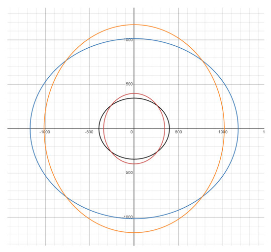 Representation of the four ellipses used to construct the section of the workspace (—red, —orange, —black, —blue).