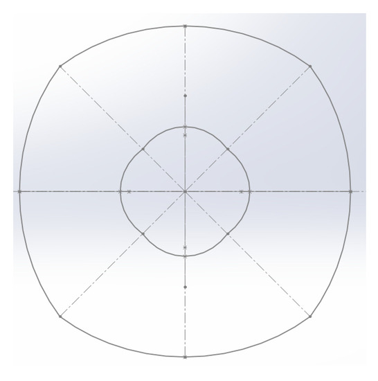 For the determination of the workspace volume, it is required to determine the area of the cross section of the workspace. Considering that the section of the workspace is constructed by the intersection of four ellipses centered in the same point, the resulting geometrical shape for the section of the workspace has two-fold symmetry among the major axis of the coordinate system (OY and OZ). In the case in which the values for the tilt angles , and are equal, the cross section gains symmetry, as shown in Figure 6, among the four major axes (OY, OZ, axis Y = Z and axis Y = −Z).