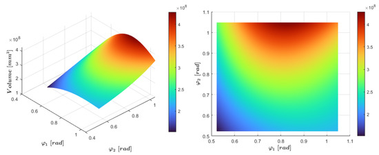It was observed that the volume tends to be at its maximum around and is the maximal value of the interval of the analysis, which, in this case, is . If the analysis interval is extended up to , the optimal value for will be , considering the behavior of the second PR(RPR)RS kinematic chain.