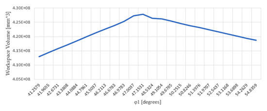 The main results summarized in Table 2 are extracted in ascending order of angle value φ1 to expose the maximum and minimum volume limits as a relation with the tilt angle. The simulation for the PKM structure starts from the initial value of 30° and almost immediately reaches the upper limit of 60°, which follows a period of descent, until it stabilizes by itself [22,23,24,25,26,27]. The results have been post-processed to present them as clearly as possible and to draw attention to the maximum value obtained for the workspace volume. As is shown in Figure 10, the volume obtained through the module of product engineering optimizer had the maximum value of 427,839,567 mm3, when the tilt angle φ1 reached the value of 47.1531 deg.