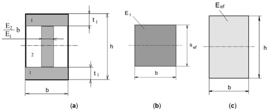 A sandwich structure of given dimensions ti and h substitutes a homogeneous layer of a certain thickness for its flexural rigidity value. We call this the effective thickness of the sandwich wall, sef; see Figure 1b. The effective thickness of the sandwich wall is thus given by the equality of the flexural rigidities according to Figure 1b.