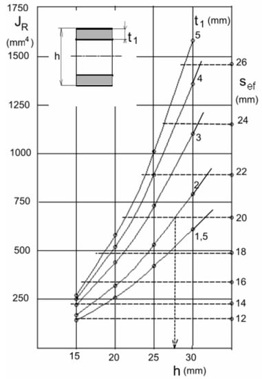 As can be seen from the diagram in Figure 2, a homogeneous wall of a given sef thickness can be replaced by structures with different geometries. Moreover, larger heights h at lower surface layer thicknesses t1 can be chosen, or conversely, thicker surface layers at lower sandwich heights h can be chosen. According to the diagram, for example, a homogeneous wall with a thickness of 20 mm will correspond to structures from t1 = 5 mm, h = 22 mm to t1 = 1.5 mm at h = 32 mm. In general, with increasing layer values t1, the material utilization and thus the effect of the sandwich structure decreases, due to higher material volumes near the neutral axis. The value of the flexural rigidity can be expressed by Equations (1) and (2). If we denote ρ1 as the density of the non-lightweight bearing layers, and ρ2 as the density of the lightweight core, the mass per unit length of the member is given by