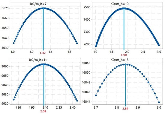 Finding the optimum thickness of the outer layers t1 for a certain height h in terms of flexural rigidity obviously means finding the extremum of the function K0/m. For the modulus of elasticity of the non-lightweight material of E1 = 680 MPa, the modulus of elasticity of the lightweight core of E2 = 170 MPa, and a degree of relative volume lightweighting of the core of 50%, the result of the optimization of the investigated structures is given in the diagram in Figure 3.