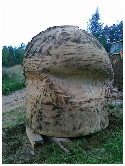 An example of the result of FEM modelling on the loss of stability of an underground tank is shown in Figure 5. The ultimate load of real tanks is always lower due to geometric inaccuracies in the tank shape, variability in wall thickness or local weakening, residual stresses, unevenness of the backfill load during tank installation, and the possible effects of groundwater, rainfall, and other aspects related to both installation and operation.