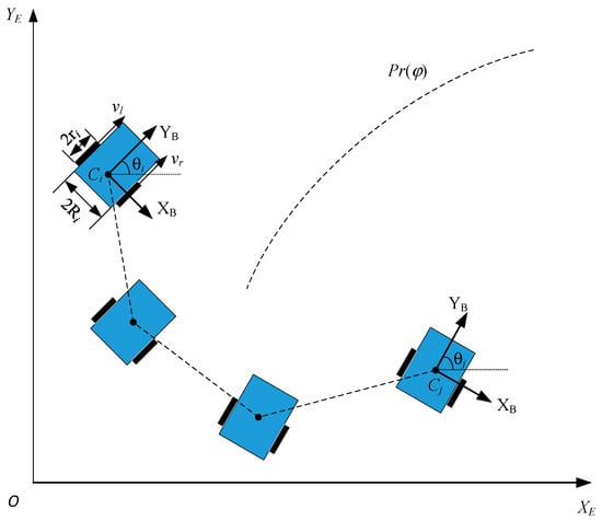 where is a positive control gain to be designed, is a positive constant satisfying , and , are the desired linear velocity and heading angle of the mobile robot, respectively.