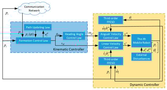 Figure 2 depicts the formation control scheme consisting of kinematic control and dynamic control. At the kinematic control level, the desired linear velocity , heading angle , and the path-parameter-updating law are obtained such that control objectives (3) and (4) can be achieved. At the dynamic level, an anti-disturbance controller based on the estimated velocities and disturbances is developed to make , , in a finite time.