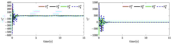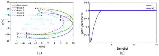 The parameters of the mobile robots used in the simulations are the same as those in [35] and presented in Table 1. The initial conditions of the mobile robots were chosen as , , , . The desired path was generated by , with the commanded speed . The desired geometry position vectors were chosen as , , , and . The extended state observer gains were set as , , , , , , and . The control gains of the path-updating law were set as and . The control gains were set as , , , , , , , and . To demonstrate the effectiveness of the proposed FFTESO-based formation control protocols, the bounded external disturbances were given as follows: