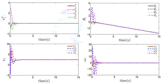 Based on the proposed FFTESO, the output-feedback-based formation control protocols were employed to achieve the maneuvering of the path-guided formation. Simulation results are shown in Figure 5, Figure 6 and Figure 7. Figure 5a shows that the mobile robots were guided to follow the path with the commanded speed and reached the desired geometry shape under the proposed control protocol, where the asterisk indicates the initial positions of the mobile robots, and the triangle indicates the positions of the mobile robots at s and s, respectively. Figure 5b shows the evolution of the path parameter. It can be observed that the path-parameter-updating speed converged to a small neighborhood of the commanded speed. Figure 6 displays the curves of the mobile robots’ states. It can be observed from Figure 6 that the formation position consensus errors of the four mobile robots, as well as the mobile robots’ heading angle, linear velocity, and angular velocity, reached convergence in a finite time. Figure 7 shows the control inputs of the four mobile robots. It is observed that the proposed control protocol drove the multiple mobile robots to keep the desired formation and follow the desired path with the assigned speed. Thus, we can conclude that the proposed control protocol is effective and efficient.