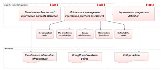 Step 1 consists of a proper allocation of information contents to the maintenance process. The output is the identification of the maintenance information infrastructure, including the most significant information databases, essential for the proper maintenance process execution.
