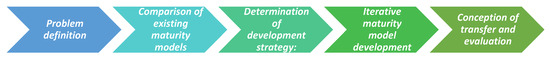 Iterative maturity model development: ‘The central phase of the procedure model is the iterative maturity model development. The sub-steps of this phase, selecting the design level, selecting the approach, designing the model section, and testing the results will be iterated’ [24].