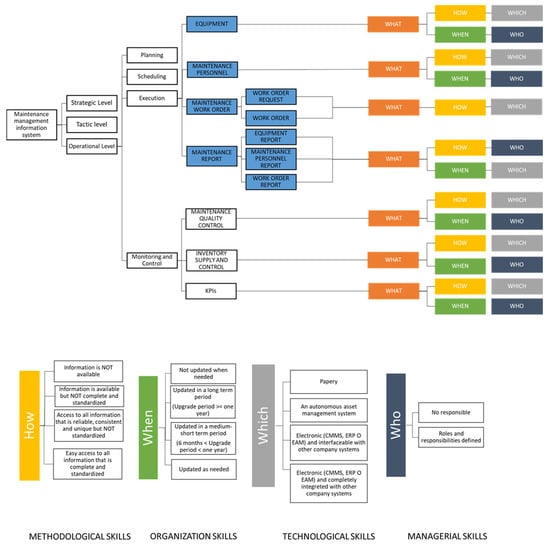 Not all the criteria are significant for each DB; therefore, for the maintenance work order only, the criteria HOW and WHEN are evaluated. Regarding the aspects included in a work order request and work order, the other criteria (WHEN and WHO) are not significant.