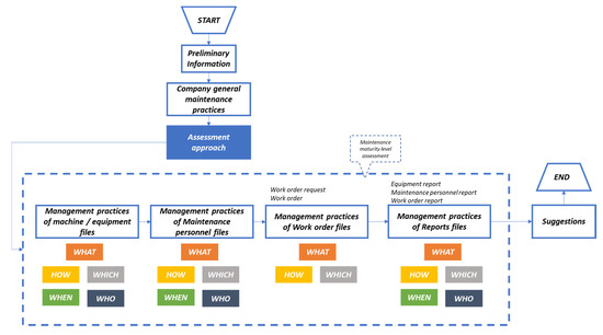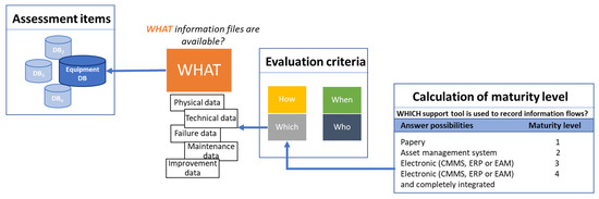 The preliminary information contains a set of questions related to the company (size, sector and operational headquarters) and the interview (professional role). A set of questions concerning general maintenance practices was included to understand the strategy and the approach adopted by the companies for their maintenance operations. Based on the fundamental structure of the model, a section for each DB containing questions for every evaluation criterion was performed. The answers are ranked, according to a description, ranging from the initial/basic practice to good/best practice. The highest ML is assigned if the existing management practices operate according to best practices; the lowest ML is assigned when the practices are either weakly available or not performed at all. For a better understanding, a practical example is provided in Figure 6.