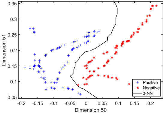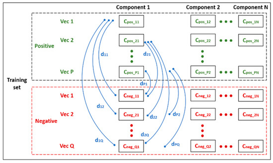 - For each component of a given embedding vector from one class (positive), , its distances to all vectors of the same component (position) from the other class (negative), are measured:These distance measurements are iterated for all the components (dimensions) of the vectors between the classes.