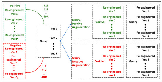 One distinctive highlight of the proposed re-engineering mechanism is the augmentation of the embedding vectors in the interactive test stage. For a given query vector set, its similarity is measured against all the categories in the training set, i.e., each measurement leads to the creation of a pair of re-engineered training–query embedding sets. The query set is, therefore, dilated by K times (K indicates the number of categories in the training set). For example, for a binary classification problem shown in Figure 3 (positive and negative), when one re-engineered query set as well as its corresponding re-engineered positive set are generated, another re-engineered query set and its matching re-engineered negative set are constructed in parallel. The resulting query feature set for evaluation is doubled in size compared to the original query set.