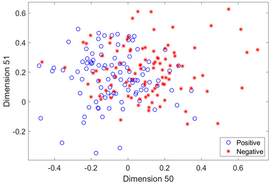 Figure 4 shows an illustrative example of the original word feature embeddings of the training set before applying the re-engineering mechanism. It is clear that after the Word2Vec, the resulting word embeddings are still not quite separable, which demands additional feature engineering to improve the discrimination. The feature distributions are plotted from two randomly selected consecutive dimensions (in this case, 50th and 51st). For clear visualization and comparison, the figure displays only the plots of the first 100 observations per class, and the full distribution for these two dimensions is found to overlap even more between the two categories.
