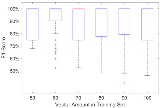 The best performance is found when the training set contains only 60 (re-engineered) vectors, with both the highest F1-score as well as the smallest variance (2nd column of Figure 6). With the size of the training set increasing, the mean performance starts to degrade in terms of both metrics, also inevitably increasing the computational time.