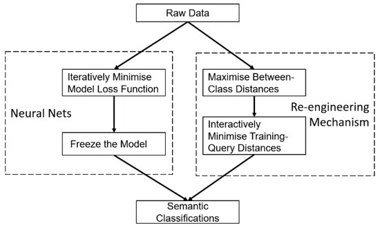 System flowchart diagram of the comparison between the neural nets and the proposed re-engineering framework for embedding feature generation. The system adaptively re-engineers the word embeddings for each given query sample to provide the best possible match, as opposed to fitting different query samples with a static model.