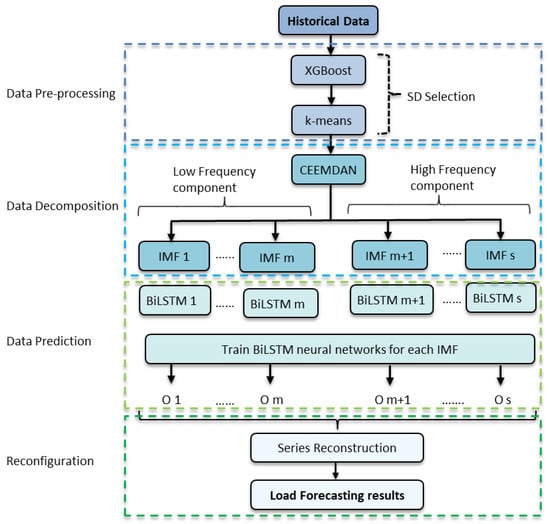 The SD selection is based on historical days that have comparable features to capture the features of load. To predict short-term load, a weekday index and weather events similar to the forecasted day were used [16]. The SD selection was applied to assess the attribute weights using the XGB algorithm and to compute the distance between the chosen day and the day that depends on different measurement attributes in different weights [12]. The authors also used the k-means algorithm to merge SDs into one cluster and applied it as input data for the succeeding load prediction based on the XGB distance. However, scientists found that the SD method cannot sufficiently capture the complex electric load features alone and it should be combined with other methods [12,16,17,18].