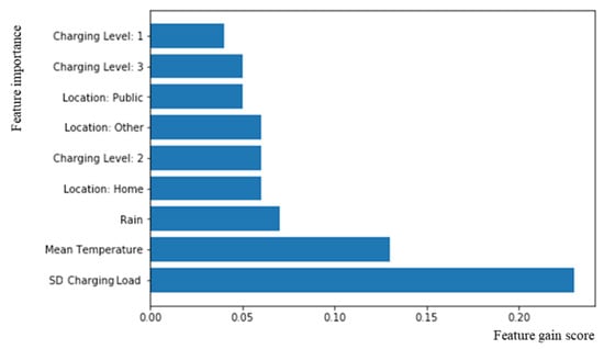 Several features described in Section 2.1 are used as inputs for the XGB algorithm to compute the feature importance with a charging load for a fleet of EVs (Figure 5). The increase in the feature importance of the individual predictors in the tree is then visualized. A higher value of the metric “Feature gain score”, compared to another feature, implies it is more important for generating a prediction. It can be seen from Figure 5 that the charge load is sensitive to temperature variables. In addition, the SD charging load, which has the highest feature gain score, is an important feature for load prediction. This assumption is consistent with the data analysis results.