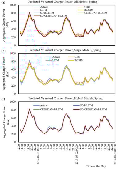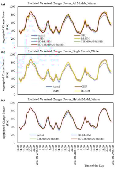 Figure 7 and Figure 8 illustrate the results of the aggregated charge power, in kilowatts (kW), during the three-day-ahead prediction period for all single and hybrid prediction models in spring and winter, respectively. The training period is from 20 August 2017 to 31 December 2018 and the three-day-ahead prediction period is from 30 April 2019 to 3 May 2019 and from 26 January 2019 to 29 January 2019 for spring and winter, respectively. It can be seen that the peak charging load during the three-day-ahead period occurred around 7 p.m., and the real error, which is the difference between actual and predicted load, is the largest at that point (Figure 7 and Figure 8). However, the proposed hybrid model that includes the SD selection and decomposition method outperformed the single (Figure 7b and Figure 8b) and other hybrid models (Figure 7c and Figure 8c) at the peak points. Although all six models show good predictive results on the three-day-ahead period, the SD-CEEMDAN-BiLSTM model achieves a comparatively better performance with the smallest forecasting MAPE of 2.63% Canada-wide. Such trends in terms of improvements of the models using hybrid methods for electricity load, wind speed, solar radiation, and crude oil price prediction performance have also been observed in reported experimental studies [5,6,7,12].