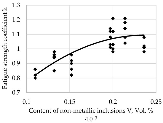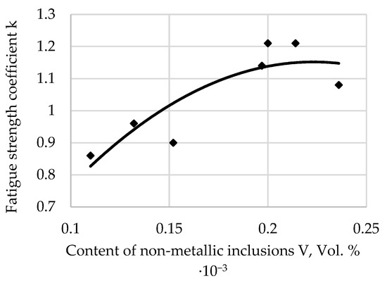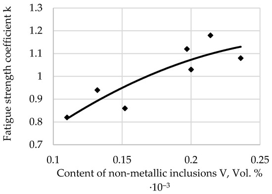 The bending fatigue strength coefficient, k, of research steel after hardening and tempering at 400 °C depends on the relative content of non-metallic inclusions and is presented in Figure 4.