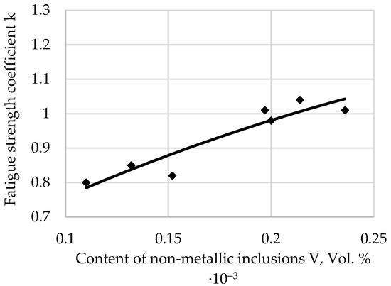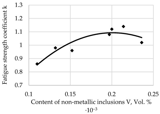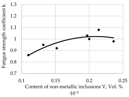 The bending fatigue strength coefficient, k, of research steel after hardening and tempering at 300 °C depends on the relative content of non-metallic inclusions and is presented in Figure 3.