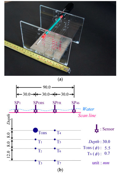 For the process of data acquisition, the model is soaked into a water tank to perform an immersed scan (Figure 1b). The P-wave velocity in water is premeasured as 1450 m/s. The active transducer used to facilitate our laboratory manipulation is an Olympus (V204-RM 2.25 MHz/6 mm) [18]. The dominant frequency of the active transducer thus makes the wavelength of the propagating P-wave 0.6 mm; hence, the dimensions of TOSB and TN are approximately ten times and equal to the dominant wavelength, respectively.