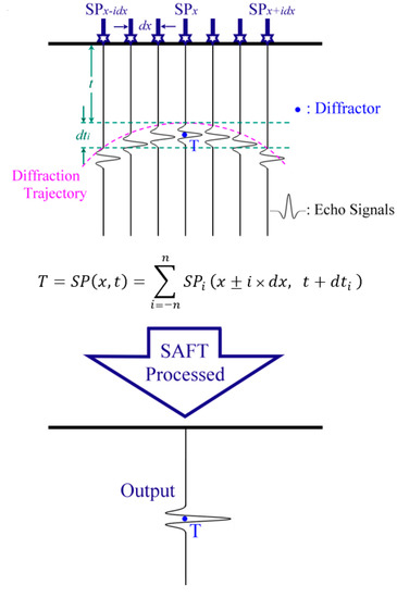 A brief description of applying SAFT to facilitate the reveal of a shadowed image is shown in Figure 2. It is assumed that a point diffractor (T) is immersed in water, and a sensor emitting a spherical wave is used to obtain a B-scan image of the diffractor (T) (Figure 2). By summing the delayed time traces of the B-scan image [SPi(x ± I × dx, t + dti)], the reconstructed image [SP(x, t)] processed by the SAFT is given by