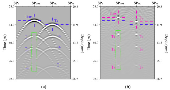 The synthetic profile is SAFT-processed; Figure 3b shows the output images of restoration. Even though part of the echo signals is purposely muted in the incomplete trajectories, T1, T2, and T3 respond to the acoustic shadow. All the hyperbolic trajectories shown in Figure 3a are successfully refocused as eight spots and repositioned in Figure 3b. The apex positions of TOBS and T4 that show up at 40.0 μs and 43.6 μs in Figure 3a are shifted upward to 37.6 μs and 41.3 μs, respectively, in Figure 3b, in response to the SAFT process. In other words, the events of TOBS and T4 are not only successfully restored, but also relocated to a new position.