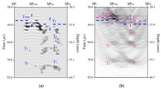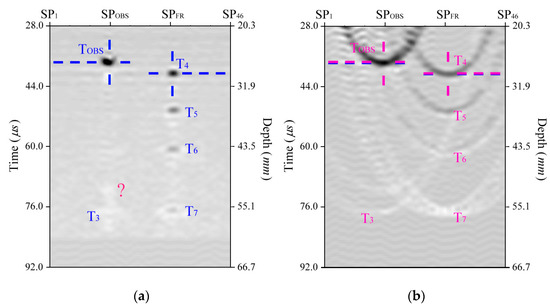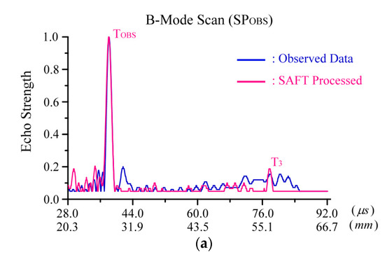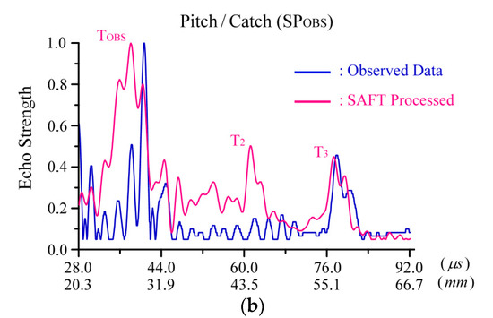 Figure 5a shows the result of the pitch/catch scan. In Figure 5a, the echoes from TOBS and T3 are detected at 40.1 μs and 79.8 μs at SPOBS, respectively. Out of TOBS and T3, one more echo is detected at 63.3 μs. Referring to the synthetic profile (Figure 3a), this new echo is identified as T2. In addition, echoes coming from T4, T5, T6, and T7 are individually observed at 43.5 μs, 53.5 μs, 63.6 μs, and 81.1 μs at SPFR. However, limited by the overlap of the beam divergence angle, the trajectories of imaged targets show up as an incomplete hyperbolae in the acquired scan [27,28]. Thereafter, the original observations are SAFT-processed. Once again, the intersections of dark blue dashed lines and pink dashed lines indicate the original and SAFT-processed images of TOBS and T4, respectively. In Figure 5b, it can be seen the original echo image shown in the raw data, i.e., Figure 5a, is not just restored but also properly repositioned.