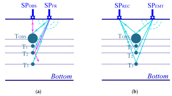In the immersed experiments, the created model is scanned by B-mode and then pitch/catch arrangements. For clarity, the theoretical echo paths for B-mode and pitch/catch scans are depicted and shown in Figure 7. In Figure 7a, we can see that when the scan is performed at SPOBS, targets (T1, T2, and T3) that are located behind the obstacle (TOBS) might not be echoed and become invisible in the original scan. Once the scanning is performed away from SPOBS, e.g., at SPFR, the shadowed targets can be partly echoed. In the essence of image restoration, an original image is restored by calculating the relationship between the echo signals of N sensors disposed of inline (multi-channel scans) and summing up all demodulated echo signals detected (Figure 3).