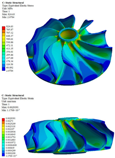The deformation, fracture, and wear of turbine impellers are typical faults of turbochargers, and they will directly affect a turbocharger’s performance and service life. The failure of a turbocharger turbine impeller has the characteristics of diversification and multiple parts due to the combined effect of centrifugal load, thermal load, and pneumatic load. Centrifugal loads make a turbine’s blades subject to tensile stresses. A thermal load makes a turbine’s blades produce thermal stress. A pneumatic load makes a turbine’s blades’ surface subject to gas pressure. Wang et al. [27] analyzed the effects of the three kinds of loads on the stress state of turbine blades, and they also analyzed the stress distribution state of turbine blades under the combined action of loads. From this study, it can be found that the effect of aerodynamic loads on the stress distribution of turbine blades is small and can generally be ignored. The major influences on the stress distribution of turbine blades are centrifugal load and thermal load. This paper takes a type of supercharger turbine as an example and uses ANSYS Multiphysics simulation software to establish a three-dimensional analysis model. Then, it analyzes the simulation model through the thermal–structural coupling module, which divides the mesh for the model, uses PLANE 55 cells to realize the coupling, and loads the temperature and speed conditions. The stress–strain distribution of the turbine under thermal and centrifugal loads, as shown in Figure 1, is obtained. From Figure 1, we can see that the maximum stress should be in the root of the turbine blade. Through the above analysis, and combined with the actual working environment of the turbine blade, it can be concluded that the root of the turbine blade is prone to fracturing under the fatigue and persistent loads.