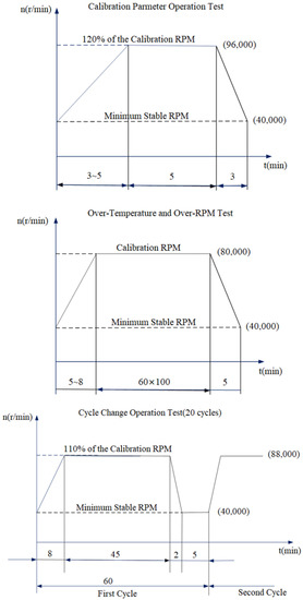 - As can be seen in Table 1, the test profile of the 350-h complete machine test for a diesel engine is mainly composed of four working conditions. Condition 1 is the calibration speed, and the torque is in accordance with the external characteristics. Condition 2 is 85–90% of the standard speed, and the torque is in accordance with the external characteristics. Condition 3 is 80% of the standard speed, and the torque is per the external characteristics. Condition 4 is the maximum torque speed, and the torque is the maximum torque. Condition 1–Condition 3 account for a high percentage of the entire test cycle, and the supercharger speed is generally not high during the no-load operation. In addition, the test is conducted in one cycle of 10 h, with 35 cycles in total. For a turbine impeller, the alternating stress test is very limited for fatigue performance assessment. Therefore, the test also mainly assesses the endurance performance of a turbine impeller.