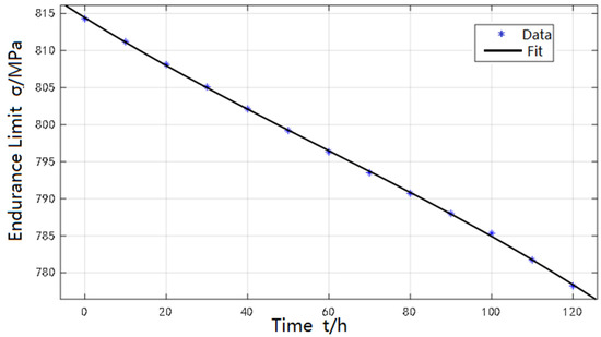 The relationship between the endurance limit and time during the test is respectively fitted, as shown in Figure 4 and Figure 5.