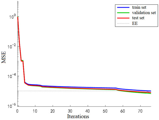 Taking the optimized data as the initial weights and thresholds of the BP neural network, after 76 iterations, the EE (expected error) is determined and we can obtain and . The results are shown in Figure 7 and Figure 8.