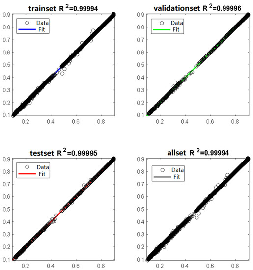 The three commonly used excitation functions in MATLAB’s Neural Net Fitting toolbox are the logsig, tansig, and purelin functions. The logsig function is a unipolar S-type nonlinear transfer function with an unlimited input range and an output range of (0, 1). The tansig function is a bipolar S-type nonlinear transfer function with an unlimited input range and an output range of (−1, 1). The purelin function is a linear transfer function with an unlimited range of inputs and outputs. In this paper, all data have been normalized to [−1, 1]. To ensure the output range, tansig and purelin are selected as the transfer functions for the neurons in the implicit and output layers, respectively.