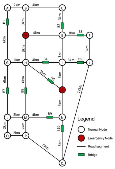 where is the PDF for associated with a given vector of intensity measures , where denotes the intensity measure at the location of the th bridge. is the PDF for , which can be estimated by the ground motion prediction equation under a given earthquake event , and is the occurrence probability of the earthquake event. In practical, the above probability transfer process can be approximated by MCS. Considering the number of damage states of a bridge under seismic hazard is , the conditional probability of the th bridge being in damage state can be written as , for . In general, the damage states of transportation network components can be divided into five levels [] (i.e., no damage, slight damage, moderate damage, extensive damage and complete damage). Additionally, it should be noted that the seismic uncertainty model formulated above may not be applicable to complex components, which need to be modelled and analyzed separately, such as suspension bridges [], cable-stayed bridges [] and long-span bridges []. In the seismic analysis of transportation network, the damage states of bridges can be used to estimate their post-earthquake serviceability [,], and the corresponding network functionality is calculated accordingly. Depending on different research concerns, existing post-earthquake functionality assessment methods of the transportation network include connectivity-based [,], traffic delay-based [,], throughput-based [,], etc., and the analysis result of each method will ultimately be reflected in the functionality indicator. For illustration, Section 4 introduces a quantitative method to measure the post-earthquake network functionality in terms of emergency response connectivity, and the method is utilized in the example of Section 5. However, it should be noted that the decision-making framework proposed in this paper is applicable to all kinds of network functionality analysis methods. Given the network damage vector , the quality of network functionality is represented by . If is assumed to be the control value that is defined by the decision makers, and the post-earthquake network functionality lower than is considered failure, we can use an indicator function to record the post-earthquake network functionality status, that is, = 1 if and 0 otherwise. Then the seismic risk (i.e., failure probability of the network) can be expressed as: