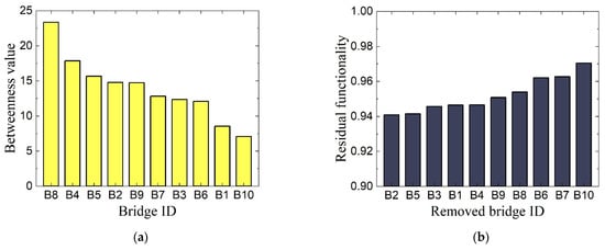 BC-based and RE-based importance ranking results. (a) Betweenness value of each bridge; (b) Residual functionality of removing each bridge.