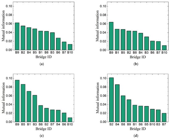 On the contrary, MI-based importance ranking varies in different cases as shown in Figure 4. The results of Case 1 and Case 2 are relatively close, but differ greatly from those of Case 3 and Case 4, indicating that the change of the overall vulnerability of the bridges has little impact on the ranking, and the vulnerability difference between bridges has a dramatic impact on the ranking. Specifically, in Case 3 and Case 4, the MI-based importance of bridges with high vulnerability increase, such as B2 and B4 in Case 4. This means that the MI-based retrofit strategy will give priority to bridges with high vulnerability, which is consistent with the general understanding in engineering practice. Note that the JMI-based importance ranking is not exhibited because it ranks the bridge sets rather than individual bridges, and will be discussed later.