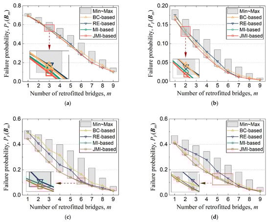 Under a given , BC-based, RE-based, and MI-based strategies select the bridges one by one according to their importance ranking, and the JMI-based strategy is identified as the bridge set with the highest joint importance value. The most direct way to measure the performance of different mitigation strategies is to compare their effects on reducing the failure probability of the network. The failure probabilities based on the four importance ranking approaches as well as the possible failure probability interval calculated by enumeration are given in Figure 5 under different conditions. It can be seen from the figure that the results of BC-based and RE-based strategies have an obvious gap with the minimum failure probabilities (i.e., optimal solutions), especially in Case 3 and Case 4 with different bridge vulnerabilities. In contrast, both MI-based and JMI-based strategies show good risk mitigation performance in all cases, and the JMI-based strategy performs even better in some situations as enlarged in Figure 5. Indeed, the JMI-based approach can be taken as a revision of the MI-based ranking by considering the second-order interactive effect between the selected bridges and the candidate bridges through Equation (9). For example, under the problem of in Case 2, the MI-based approach selects B9 and B1 according to Figure 4b, however, the JMI-based approach selects B9 and B5 because they have better complementary effect, which is reflected in . Similarly, under the problem of in Case 3, the JMI-based approach selects {B1, B3, B5, B7, B8, B9} instead of {B1, B2, B3, B5, B8, B9} because . Table 4 lists the sum of the failure probability gaps between each strategy and the optimal solution, where the total deviation of the MI-based strategy is less than 2% and that of the JMI-based approach is less than 1% in each case.