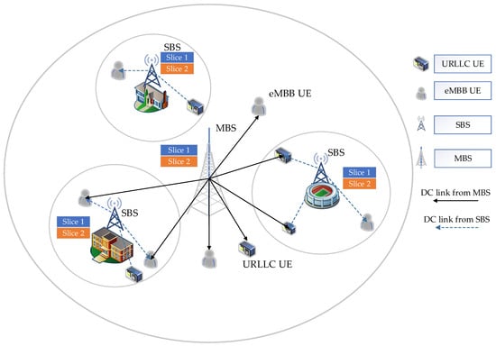 Rapidly growing user equipment (UE) and traffic demands place greater requirements on spectrum resources, and the number of connected devices is expected to reach 27 billion by 2024 [1]. An effective solution is to deploy small base stations (SBSs) with smaller coverage and transmit power to increase network capacity, while preventing macro base stations (MBSs) from being overloaded [2]. On the other hand, with the development of internet of things (IoT), the rise of more heterogeneous services makes the resource allocation and scheduling of next-generation 5G/6G networks face greater challenges, such as remote operation, VR video, internet of vehicles (IoV), intelligent factories, smart energy and IoT with thousands of connected devices [3,4]. Existing single network architectures are often unable to meet this level of heterogeneity. Network slicing (NS) is one of the key technologies in 5G architecture, which can divide a physical network into multiple logical networks (i.e., slices) with different network characteristics, through software-defined networking (SDN) and network function virtualization (NFV) technologies. The 5G network architecture is designed to support the following three basic service categories: massive machine type communication (mMTC), enhanced mobile broadband (eMBB), ultra-reliable and low latency communication (URLLC); each service has a different set of network metrics requirements. In short, network slicing plays an important role in meeting the QoE requirements of different applications in wireless networks [5,6,7]. At the same time, in order to solve the problems of scarcity of network resources and low utilization of resources, dual connectivity (DC) technology was proposed in Release 12 of the 3GPP. Specifically, through carrier aggregation technology, UE can connect two different network interfaces to obtain more network resources. It not only improves the utilization of network resources, but also improves the network system throughput [8,9]. Combining these two technologies can improve the utility of the network system, where the utility usually includes QoE, system throughput, spectral efficiency (SE), energy efficiency (EE), etc. In most of the literature, network utility is usually used as the total optimization objective. In this paper, network utility is the weighted sum of network throughput and QoE, minus the weighting of additional energy consumption caused by dual-connected users. Among these optimization metrics, QoE is always constrained by the delay and rate when users receive data packets. However, in 5G/6G systems, it is not only QoE that is greatly enhanced. Due to the role of the DC, the association handover mechanism, mobility management and power allocation strategy will be greatly changed.