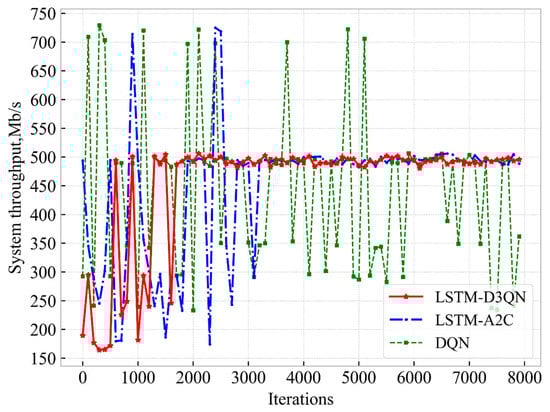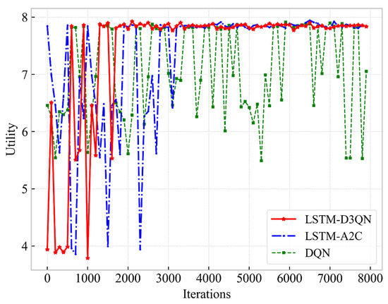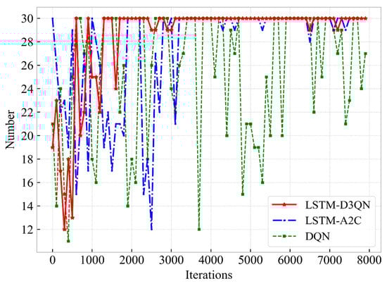 Figure 3 illustrates the change in the system utility for a certain number of iterations. It can be observed that DQN cannot converge to the optimal utility after 8000 iterations, while both our proposed LSTM-D3QN algorithm and the state-of-the-art LSTM-A2C algorithm can converge to a higher system utility and stabilize at around 7.8 after convergence. Nevertheless, our proposed algorithm is nearly 1500 iterations faster in convergence compared to LSTM-A2C. Figure 4 shows the variation in the number of dual-connected users with the number of iterations. It can be observed that as the number of iterations increases, our proposed LSTM-D3QN and LSTM-A2C can both converge to 30 users.
