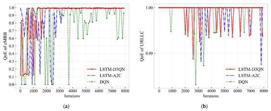 The comparison of QoEs for different methods. (a) The comparison of QoE of eMBB; (b) the comparison of QoE of URLLC.